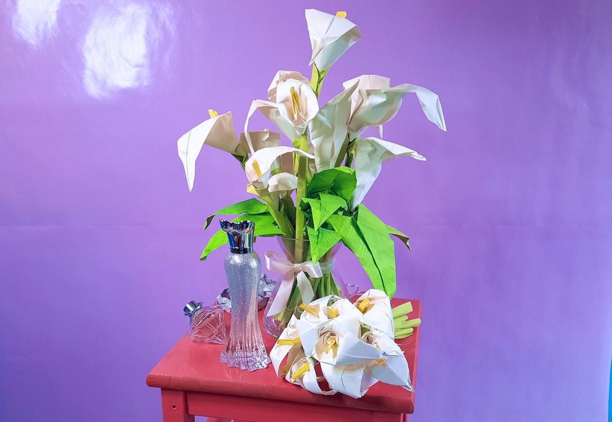 These white Calla Lilies with large stamens are my own design and each flower is folded out of one paper square.  I placed them in a nice glass vase and added some large leaves to the arrangement. I also added a wedding bouquet of smaller Calla Lilies which is wrapped together by a white ribbon.