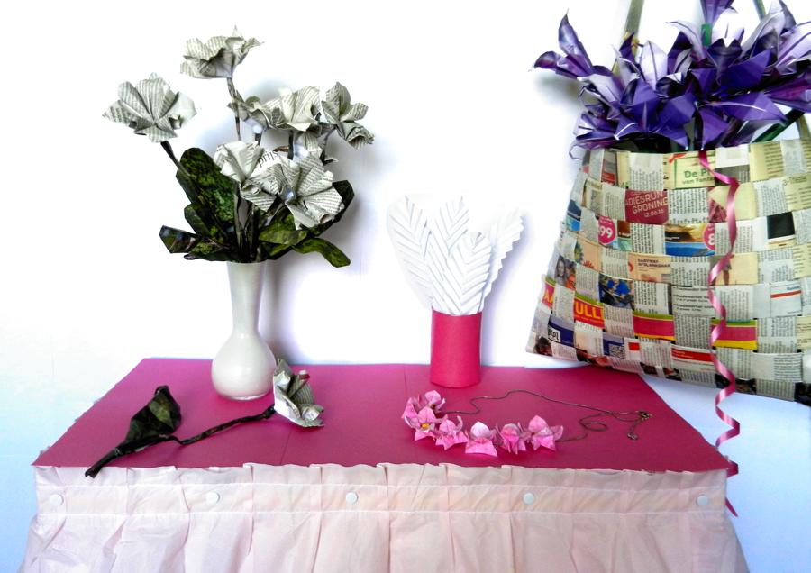 flowers, Barbie in Origami dress, Newspaper bag with Origami