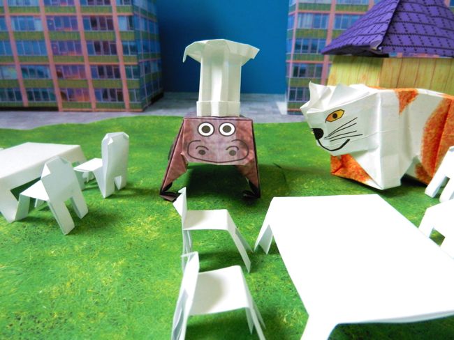 origami(dieren,bomen), kirigami(auto's) of papierknutselwerk(de gebouwen).