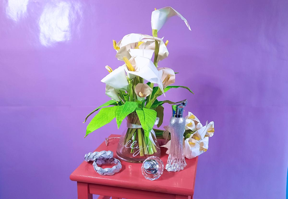 These white Calla Lilies with large stamens are my own design and each flower is folded out of one paper square.  I placed them in a nice glass vase and added some large leaves to the arrangement. I also added a wedding bouquet of smaller Calla Lilies which is wrapped together by a white ribbon.