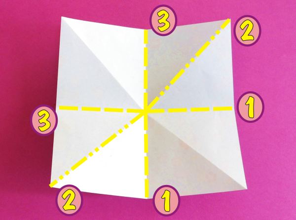 Hierbij worden de vier hoeken naar het middelpunt gevouwen