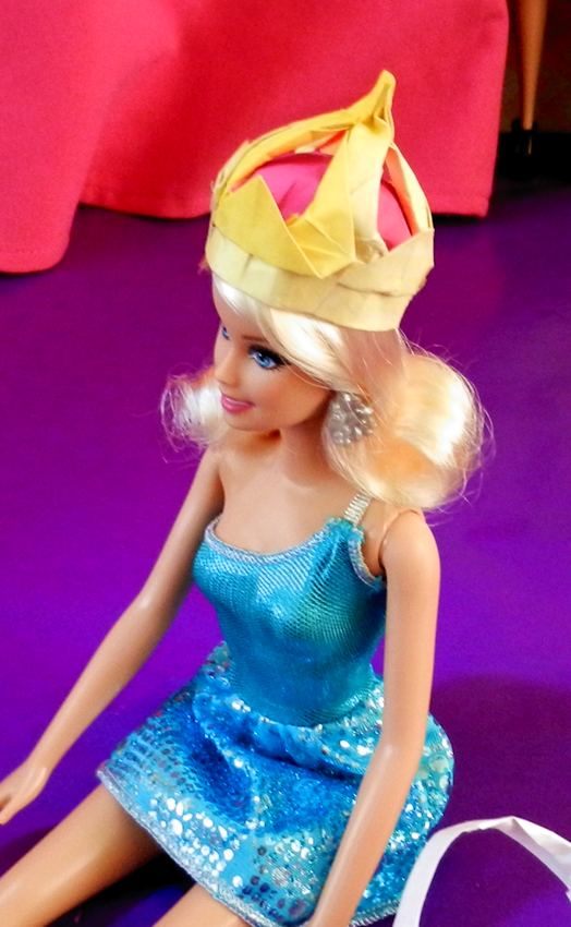 met koninginnenkroontje, Barbie in Origami jurk, Origami