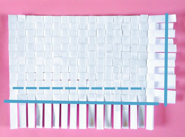 Plak zo om en om de 12 lange stroken aan de korte vast.