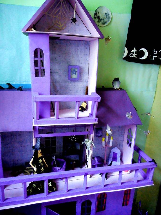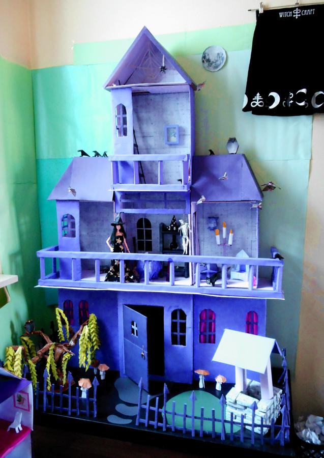 Heksenhuis heb ik gemaakt van karton en paars papier, het is